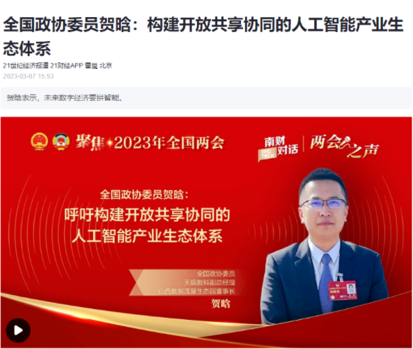 新華社客戶端 | 全國兩會(huì)專題報(bào)道全國兩會(huì)已經(jīng)召開,第十四屆全國政協(xié)委員,天娛數(shù)科董事、副總經(jīng)理賀晗,針對我國人工智能產(chǎn)業(yè)生態(tài)體系的三大短板,提出要加快推動(dòng)數(shù)據(jù)要素高效流