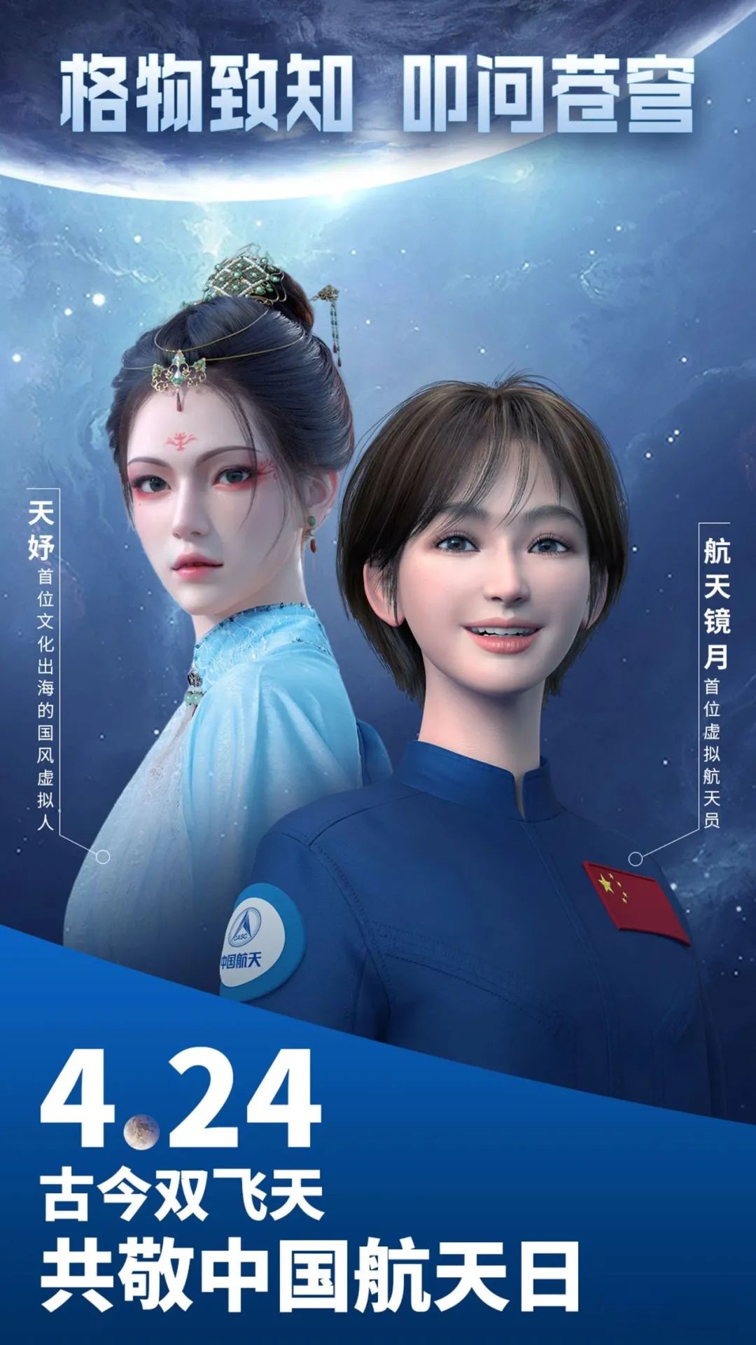 “格物致知,叩問蒼穹”。4月24日,在第八個(gè)“中國航天日”來臨之際,天娛數(shù)科旗下虛擬數(shù)字人天妤攜手首位虛擬航天員鏡月發(fā)布雙人主題海報(bào),共同致敬中國航天日。二者以“古今雙飛